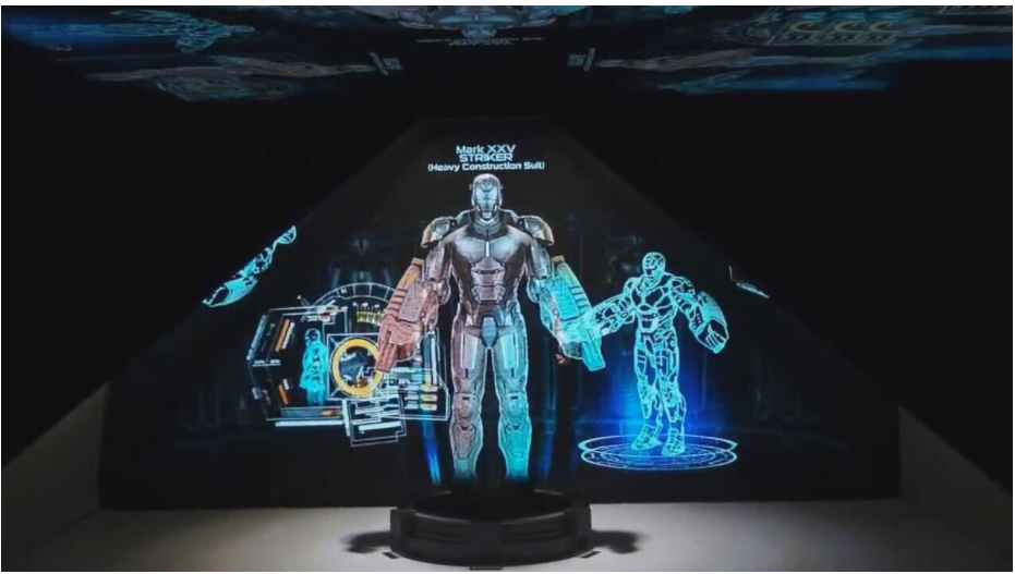 全息成像:采用投影儀或其他顯示方法,將光源折射45度成像在幻影成像膜上,稱之為全息投影。該技術可以使立體影像不借助任何屏幕或介質而直接懸浮在設備外的自由空間,可以實現270°或者360°任意角度看都是三維影像展現效果,觀眾的視線能從錐形空間里看到自由漂浮的圖像。
